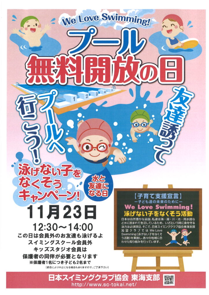 11月23日(日)のご家族自由遊泳は、会員外のお友達も泳げます!!